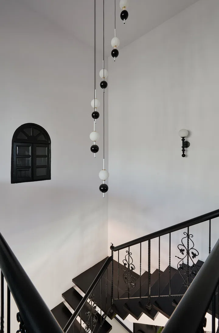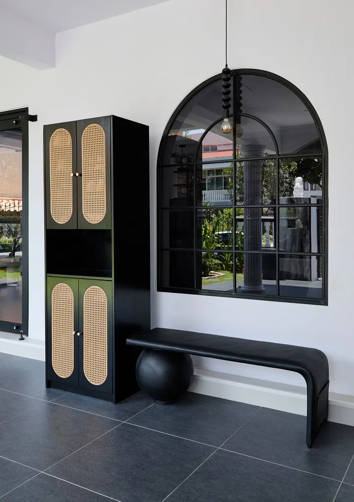 The rattan backing of the black dining chairs inject a colonial vibe and echoes the rattan doors of the cabinets in the car porch and under the staircase.