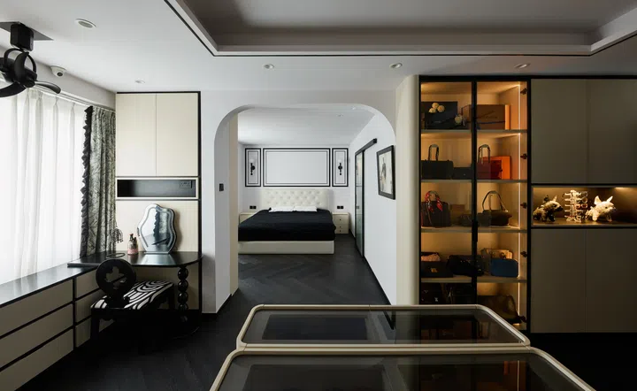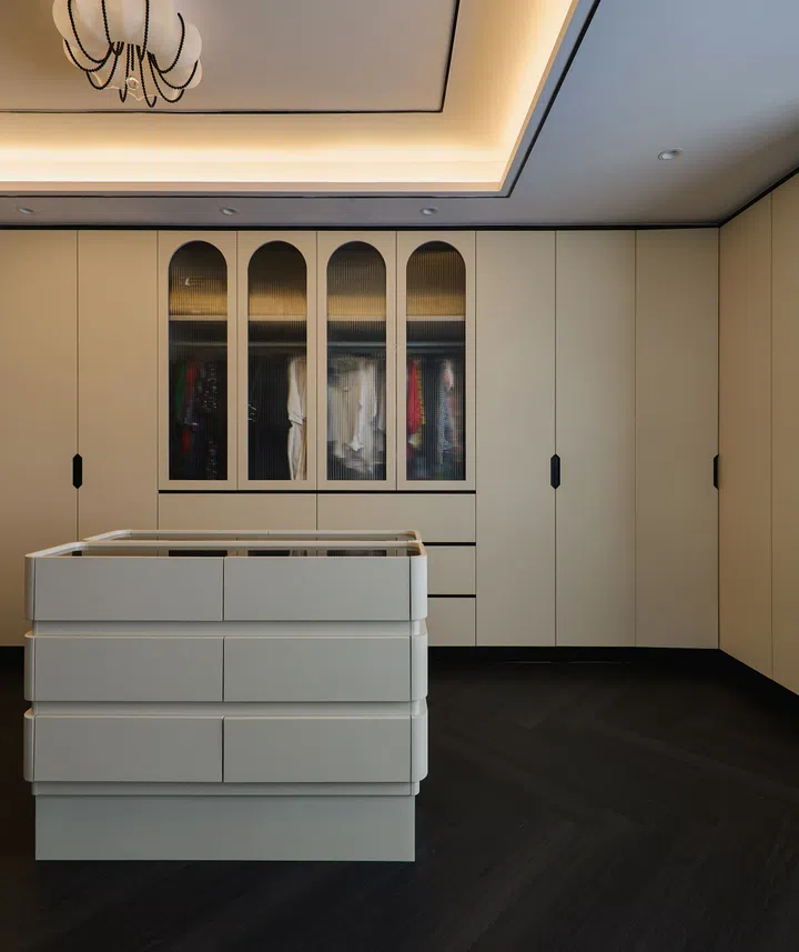 Apart from floor-to-ceiling built-in wardrobes, cabinets and bag storage shelves all around, the walk-in wardrobe also includes a vanity area where homeowner April can put on her make up, as well as an accessory island in the middle of the room.