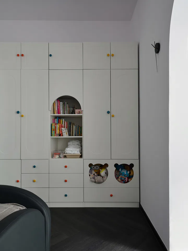 A black and white ensemble may seem too sombre for children, but interior designer Shermin added fun and age-appropriate elements such as the Mickey Mouse bedframe, side table and cut-outs in the wardrobe doors, along with colourful knob handles.