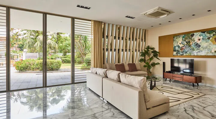 The house is very bare at first glance. It’s only fitted with essentials - a TV, sofas, dining table, kitchen, etc. The interior design clearly harks from decades past, and furniture are starting to show signs of age. The aircon units are yellowing, and terrazzo floor tiles told us everything else we needed to know.