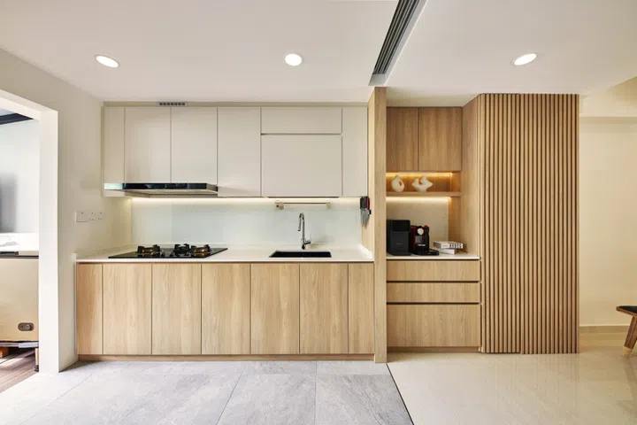As an early riser, the pantry is where Bee Ling gets her quick coffee fix every morning. It is a light-filled space that flows into the living area and the Japandi theme comes through in the selection of laminates and finishes. Unobstructed space was a priority for the kitchen as her father-in-law cooks every day from Mondays to Fridays.