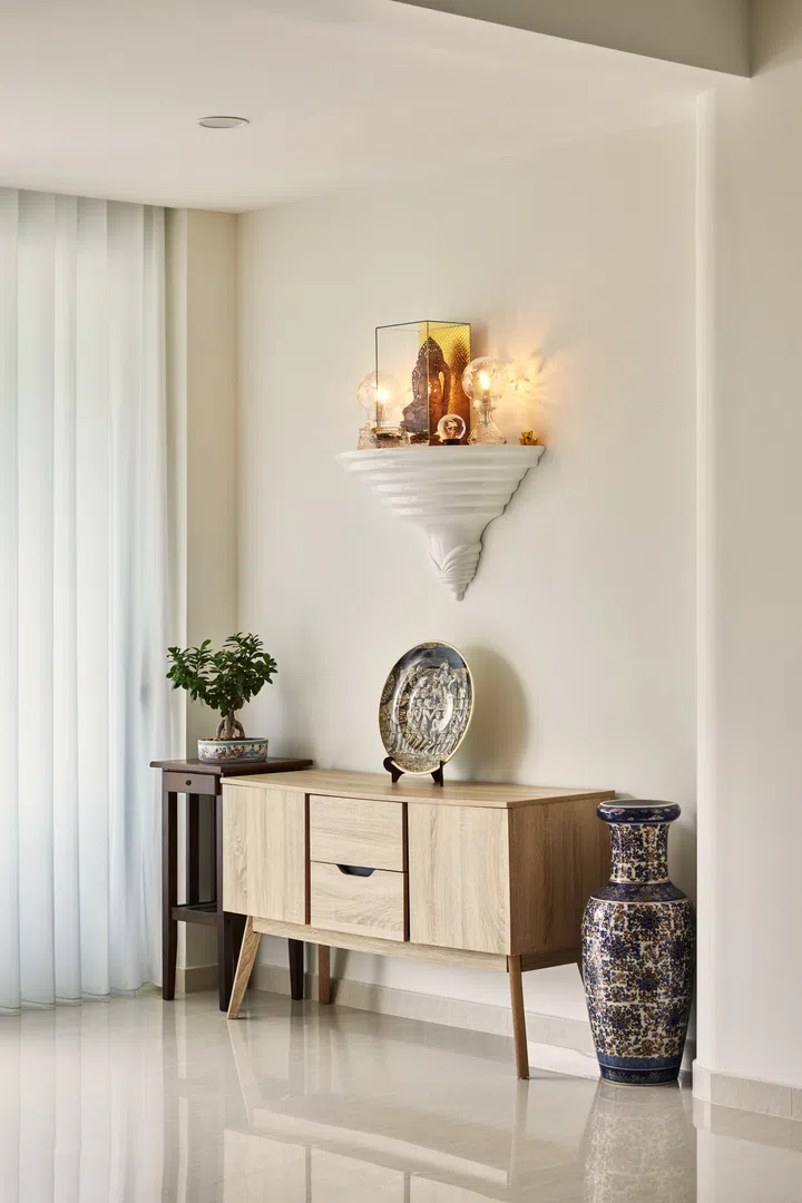 It was important for the family that the entrance foyer feel welcoming and shower all who cross the threshold with blessings. The bright and airy corner, along with the home’s white and beige colour scheme gives off very positive vibes and makes it the ideal spot for the altar and a bonsai that signify peace and harmony. Heirloom pieces such as the porcelain vase belonging to her father-in-law lend the space a gallery-like presence.