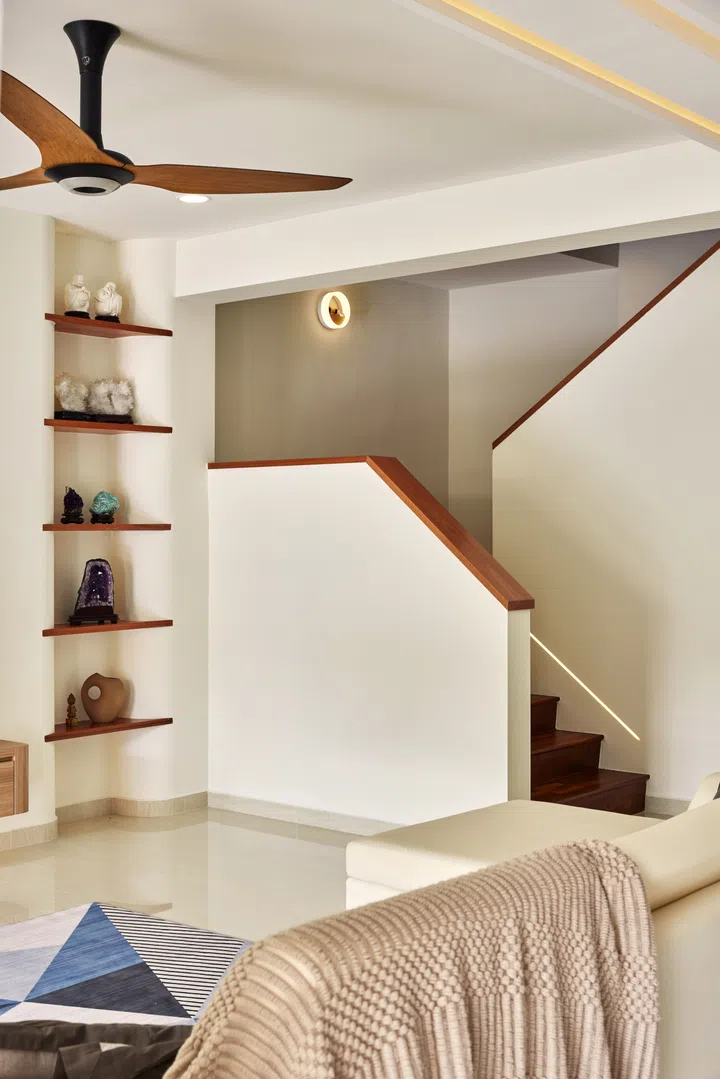 A series of open shelves built into a niche in the wall in between the television and the staircase is where her husband’s and in-laws’ collection of crystals and figurines takes pride of place. “We believe that crystals, other than providing healing properties, can transform the atmosphere of a space by enhancing its aesthetic and setting the desired mood, whether for relaxation, creativity, or positivity. Putting them at an eye-catching position sets the mood right,” she points out.