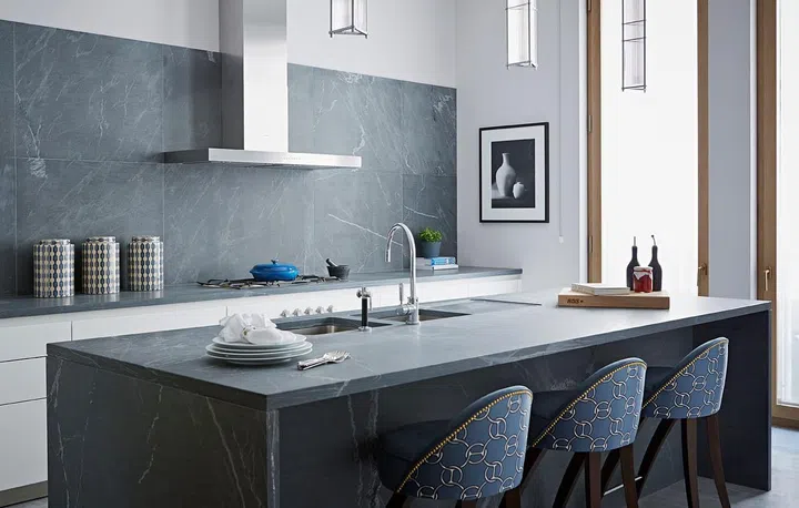 The kitchen was kept simple with its clean-cut furnishings, and features a marble island counter and backsplash in a cool, grey hue.