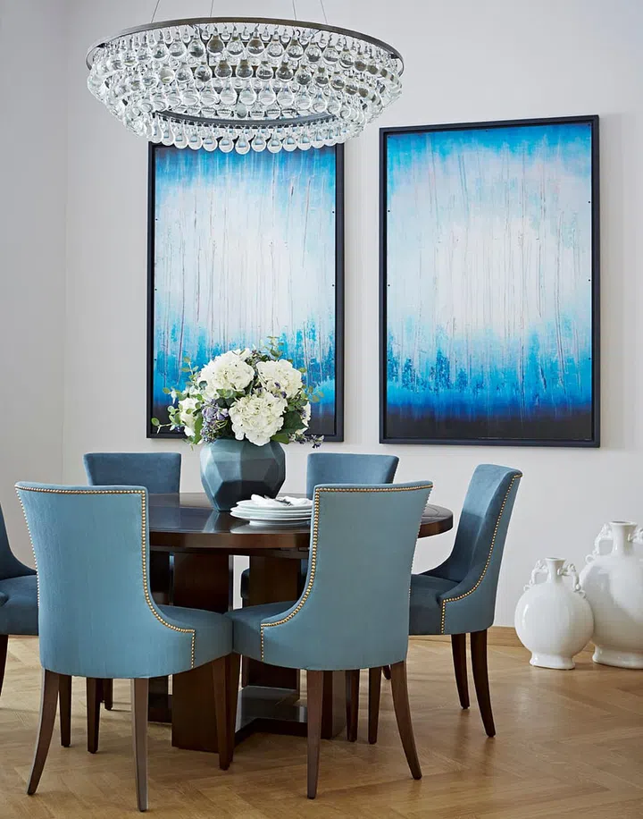 In the dining room, the designers picked chairs upholstered in blue fabric, as well as a blue vase too match. To break up the monochrome palette, they chose a dark wood dining table.