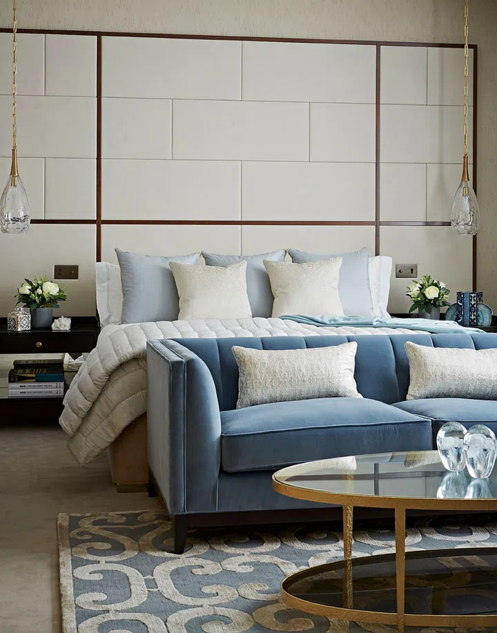 For a cosy atmosphere in the bedroom, the designers chose plush bedding and sofas. The hints of gold from the pendant lamp and coffee table add a touch of glamour, too.
