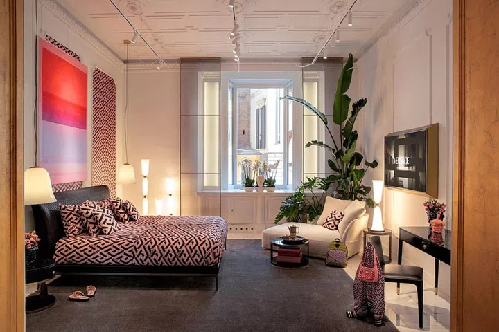 The brand’s new La Greca pattern, which is a modern interpretation of the iconic Greek Key motif, evolves from the runway to the home and forms a jacquard that dresses furnishings. The pattern also provides a backdrop for some of the rooms in the Milan store.