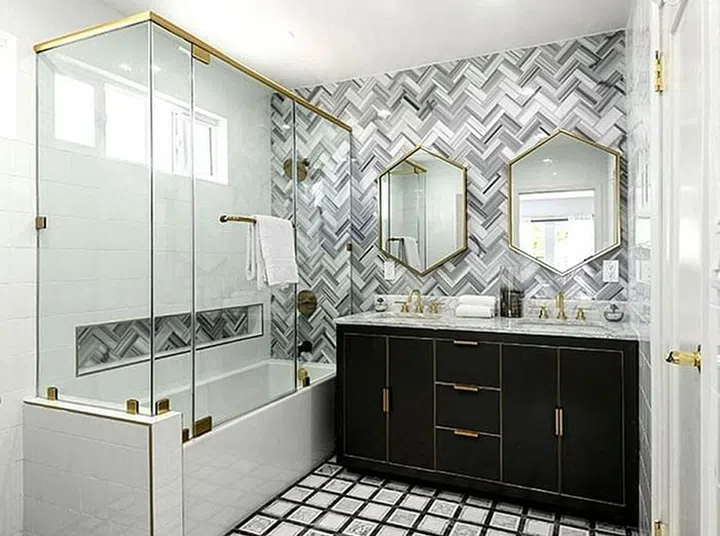 Megan's bathroom features gold trims, a marble countertop and herringbone features. Perfect and luxurious for a queen!