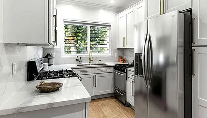 An all-white colour palette, as well as natural sunlight, helps visually enlarge the cosy kitchen space.