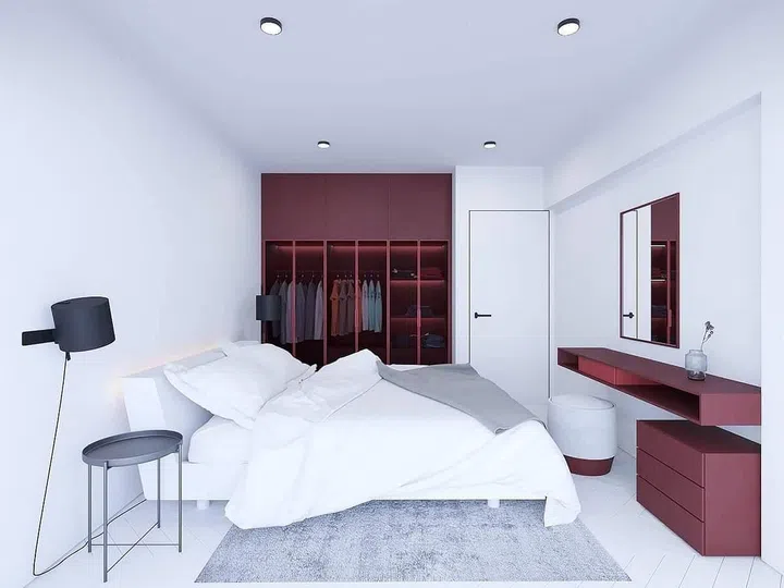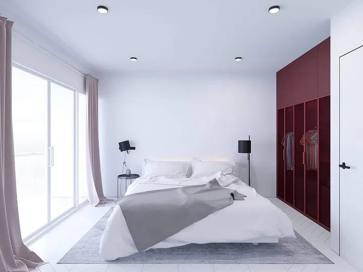 Once you’ve decided to go with white as base colour in your home, the next thing you want to do is to break the spaces up into individual rooms and select one accent colour for each of them. That accent colour should go over the largest piece of furniture in the space, so you can then style the rest of the room around it. Take this bedroom for instance, the bed (being the largest piece of furniture in the space) comes in a dark plum shade. It becomes the main accent colour in the room, and it is enhanced with the use of black in the side table and TV screen.