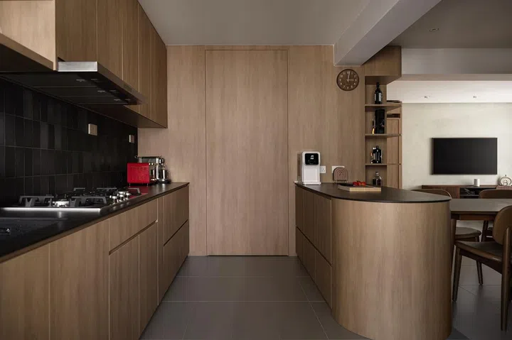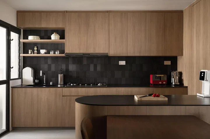 Use of the same wood veneer throughout the living and open kitchen helps to bring both spaces together, creating the impression of a much larger space. Matte black tiles for the backsplash, along with the sleek black countertop, provide a beautiful contrast to the light wood tones. Notice how there are also no handles on the cabinetry in order to achieve a flush, seamless effect across the walls.
