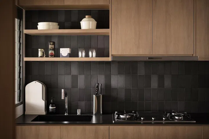 Notice how the subtle differences in the grey tones of the wall tiles give the kitchen a modern and unique style.