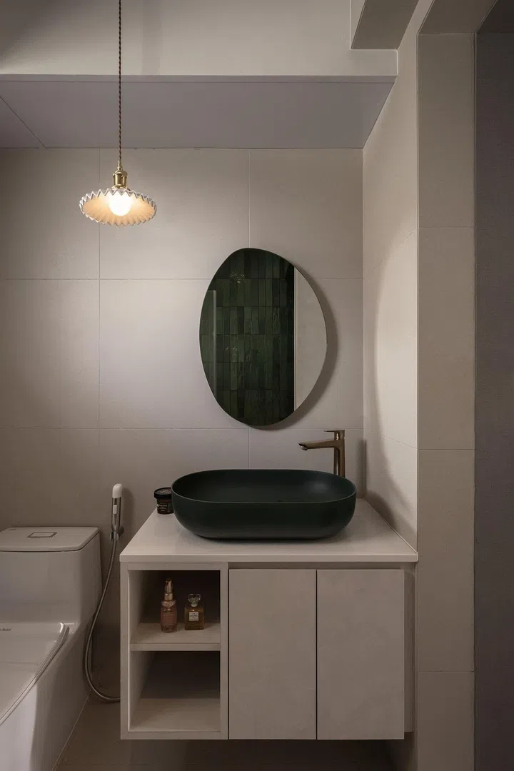 The bathroom may be simply designed, but the gentle and organic curves of the sink and mirror allow them to stand out prominently. By becoming the focus of the small space, they result in creating a more spacious-looking bathroom that can also become a space for a personal retreat.