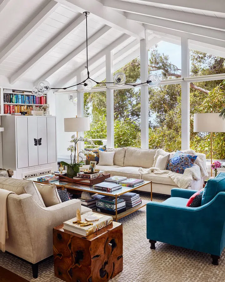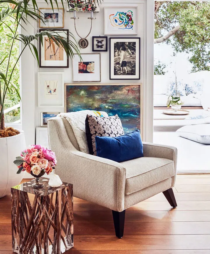 “I knew this house was it at first sight. It felt so right. In some ways it feels like a tree house. That’s another thing that I loved. It’s all open, and the view of the ocean makes it feel more spacious.” Kerr’s top priority for the house was to make it a “sacred space,” a calm refuge from her hectic schedule that was filled with small reminders of a happy childhood in Australia. To achieve that, she started with a neutral background of pale grass-cloth wallpaper, white walls, and cream-coloured upholstered pieces, then added layers and layers of textiles. I like to experiment with texture and fabric more than colour,” she explains. “I’m a tactile person, so there are so many different types of fabrics around the house, like layered curtains and fluffy rugs, throws and pillows, and just a few pops of colour.”