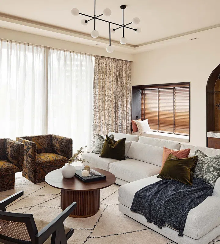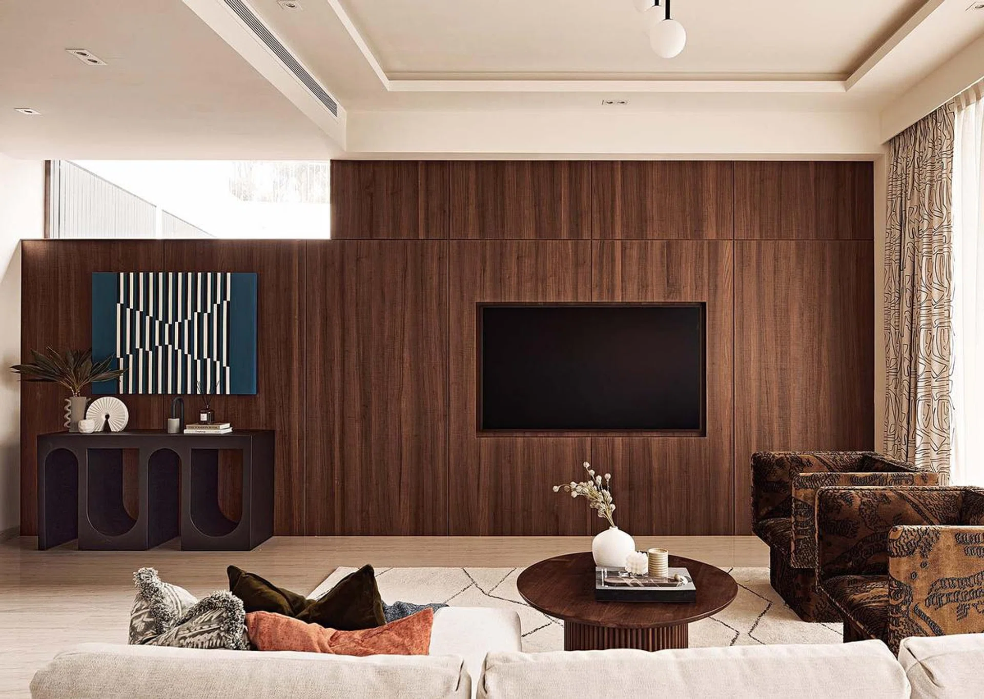 The design team accentuated the sense of volume with a full-height television feature wall and stepped ceiling features. The intention was also to spotlight the furnishings with shapes and styles to complement them.