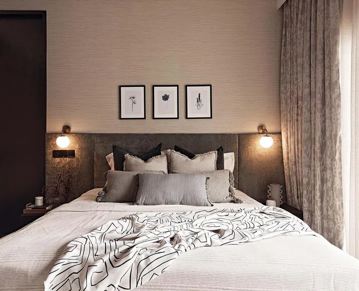 For the master bedroom, the homeowners loved the idea of muted but rich colours, textures, and contrasts in tone. The design team created a material palette comprising velvet for the headboard, grass cloth wallpaper, and dark wood for the wardrobes. Rattan elements were added for lightness.
