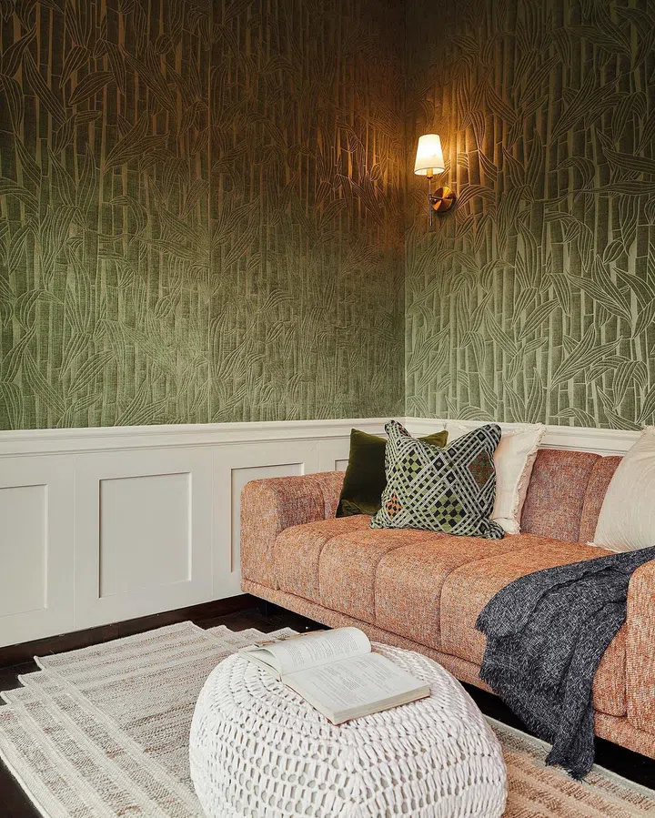 The striking wallpaper with bamboo patterns, a cushy sofa, wall mouldings, and wall lighting make this a practical space awash with flair. A compact table nestles between the wardrobe and door that leads out to the balcony. Rattan surfaces soften the space further.