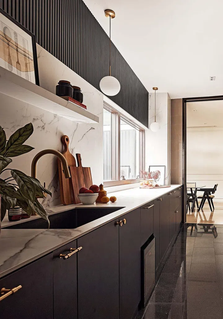 Matte black cabinets with white marble-veined porcelain stone countertops now fill the kitchen. Because the kitchen also has a high ceiling, the design team considered the accessibility of the kitchen cabinets. Instead of installing upper cabinets, the lower kitchen cabinets are complemented with fluted panels on the wall and an easy-to-access shelf.
