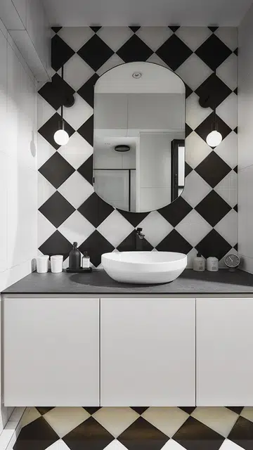 The master bathroom is a playful twist on monochrome, with checkerboard tiles that add a whimsical touch to the extended space. From the vanity to the black-and-white colonial-inspired details, every element feels cohesive yet full of personality.