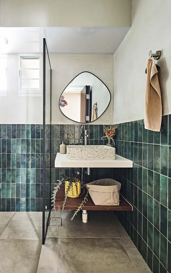 The common bathroom has its bottom half of the wall cladded with glossy dark green tiles and cement screed on top, a combination that Nigel feels differentiates it from the rest of the home and makes it stand out.