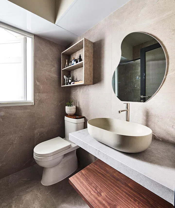 An organic, blob-shaped mirror and a wood-textured open shelf below the basin can be found in both bathrooms.