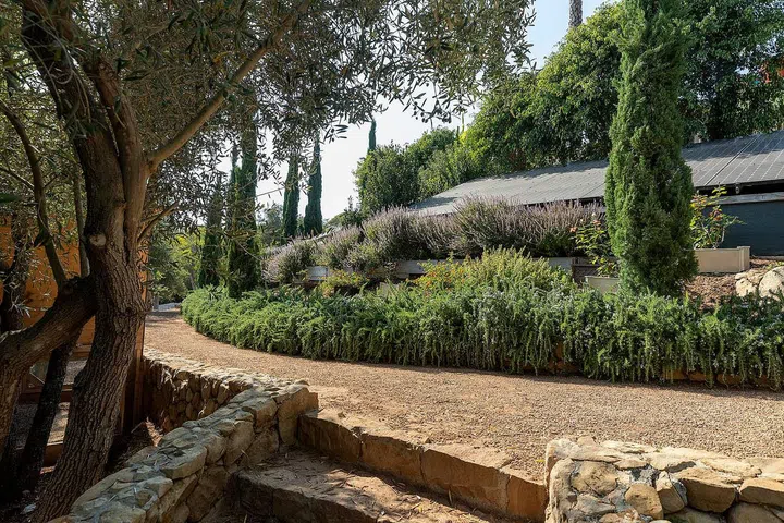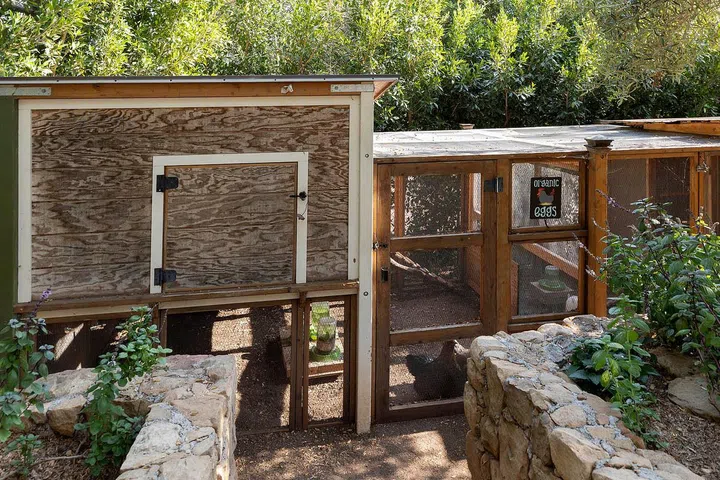 The home’s exterior includes two acres of lush grounds with romantic walkways and year-round flowers, soaring palm trees and accent vines, a vegetable garden, citrus orchards, and even a chicken coop for fresh eggs.