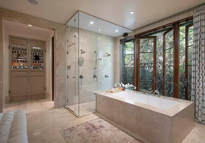 A classy and marble-clad master bathroom that's joined that the primary bedroom.
