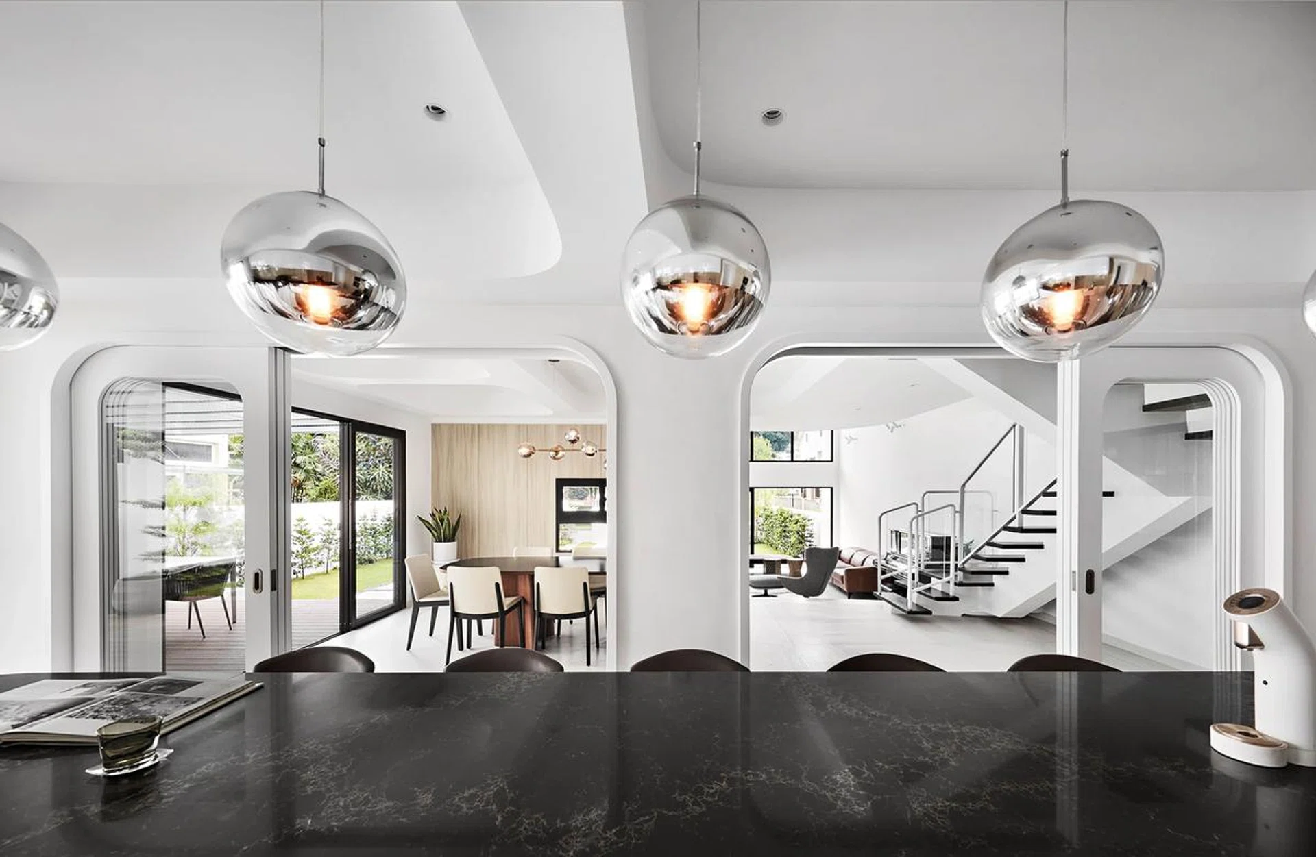 Curved elements - from balustrades and door frames to the kitchen island and ceiling hollows, create an interesting aesthetic and take their cue from the existing form of the second storey mezzanine that overlooks the living area.