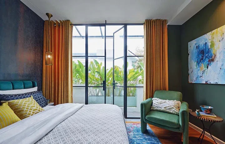 The master bedroom is a light-infused and fun space that is filled with colour, from the mustard yellow drapes, turquoise headboard and green armchair, to the rust-coloured wallpaper, blue-and-red Nasser Nishaburi rug and colourful abstract painting.