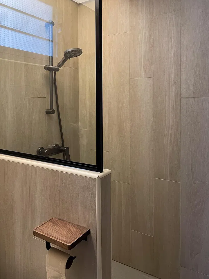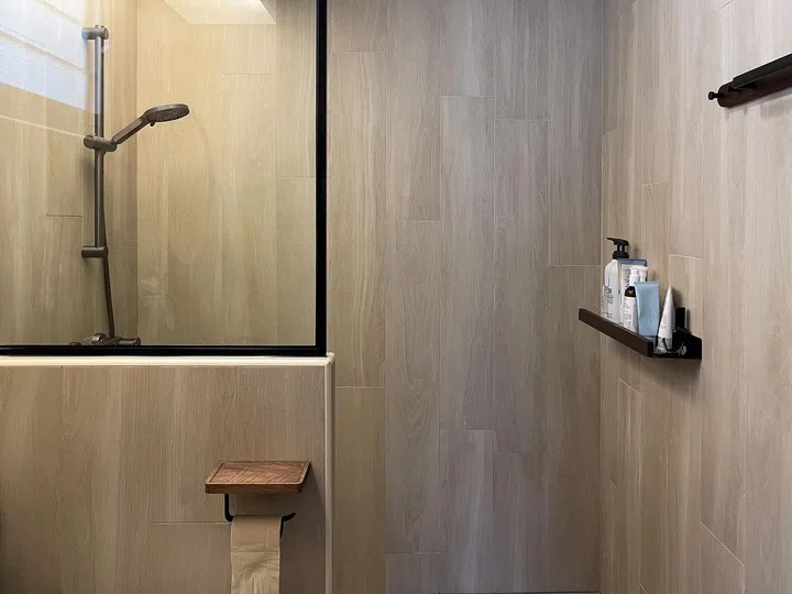 Wood-look tiles in the bathroom and the black frame around the glass partition makes it feel like a naturally-flowing part of the whole home.