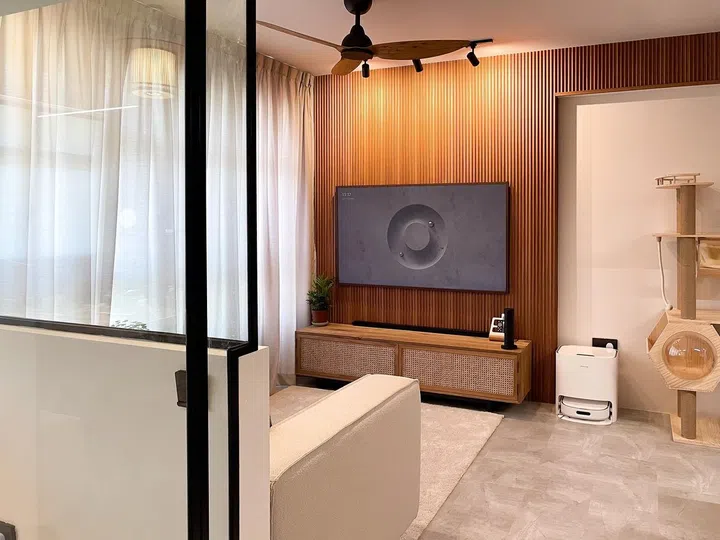 The recurring use of fluted panels for the statement wall in the entrance and the TV wall helps to bring both spaces together seamlessly. The consistent design language used throughout gives the interior a polished and professional finish. In this living area, we also see accents lights used instead of a ceiling light. By castling light onto the walls and letting it deflect into the space, you get this soft ambient glow, which is relaxing to the eye. In order to open up the space, the ID also used a glass panel to partition the living area from the workroom. This helps to maintain visual continuity between the rooms without compromising on their functionality.