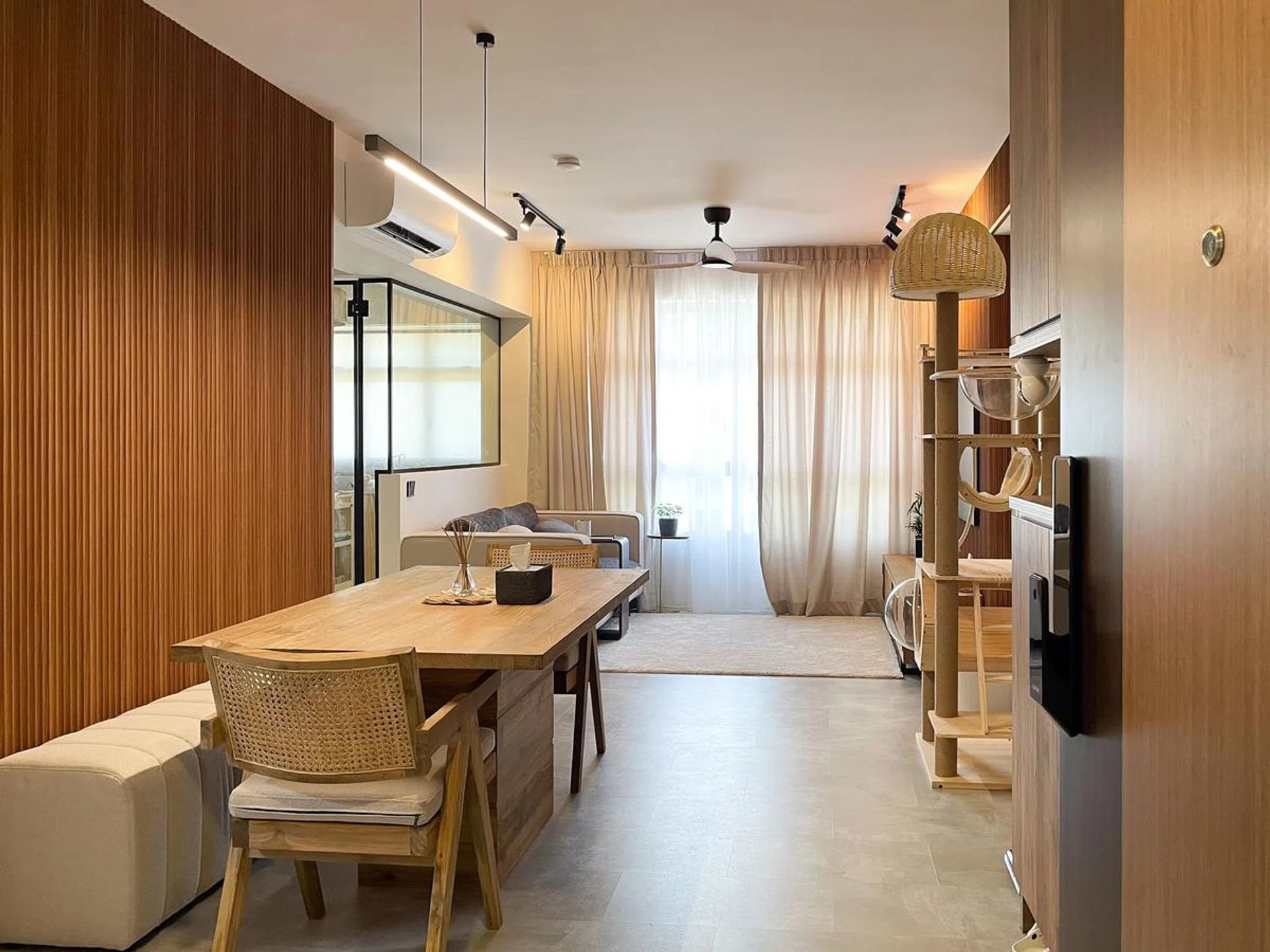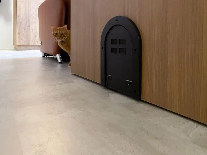 We also like that details, such as the cat tree, has also been thoughtfully worked into the design of the living area. The use of natural textures, like the wood and rattan, make the common area feel stylish and sophisticated.