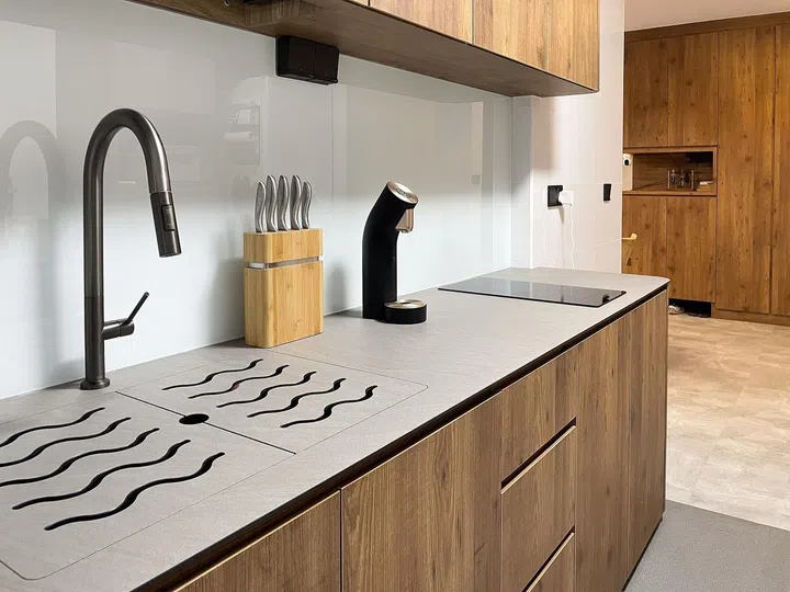 Earth tones continue into the kitchen area, where white is used as the base to help bring out the woodgrains of the cabinetry. The ID team also used the same countertop material to create a cover for the sink area, turning it into additional worktop space. Very clever!