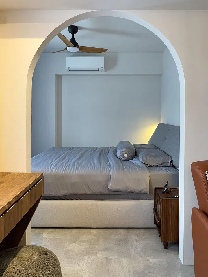 An arched doorway leads into the bedroom, giving the home a rustic yet inviting feel. Although we're not so sure about the choice of the white bedstead (it probably would have looked even more consistent if the same wood laminate was used), it's not a big issue in this case.