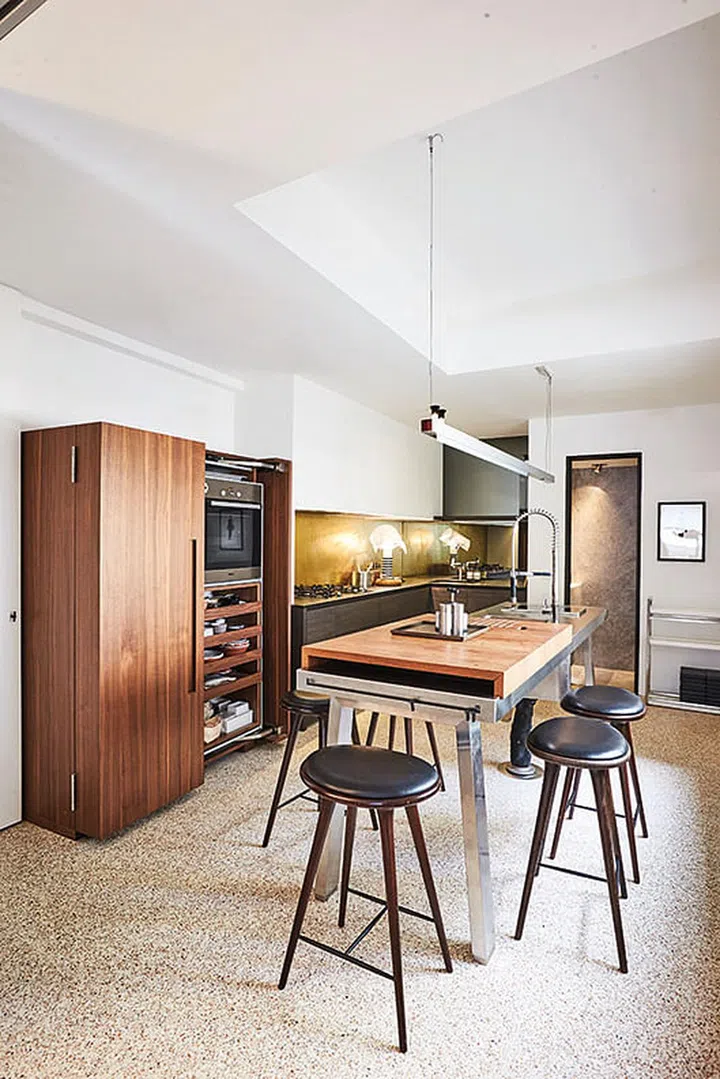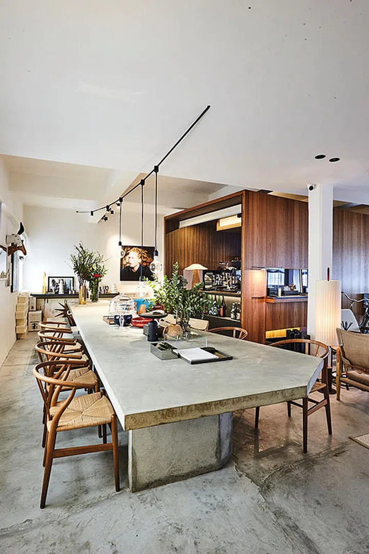 In place of a traditional long table, Terence decided on a kitchen counter instead, and created a functional kitchen space where he can host clients and guests over meals.