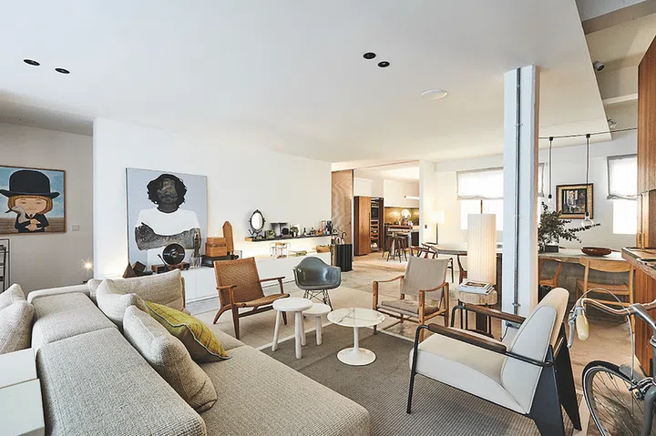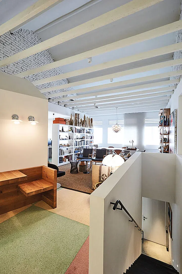 The living room on the second floor has a selection of designer chairs that Terence collected over the years, like the Hans Wegner CH25 lounge chair and Vitra’s Eames DAW chair, among others. Having these home settings within a studio offer space for casual discussions.