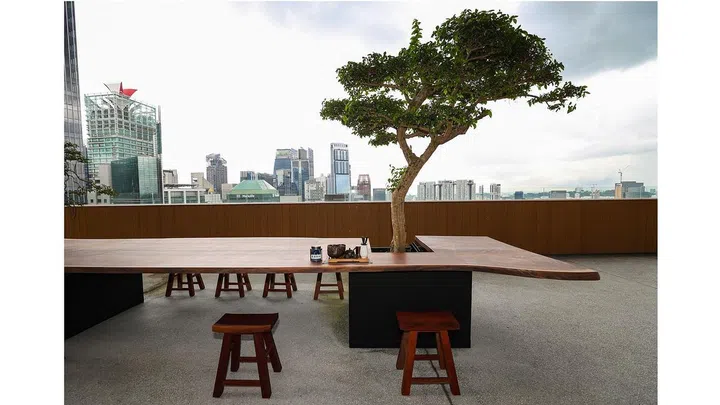 Located on the 34th floor of OCBC Centre, the space has two outdoor terraces - one which overlooks the Chinatown area while the other has a clear view of the CBD and Marina Bay.