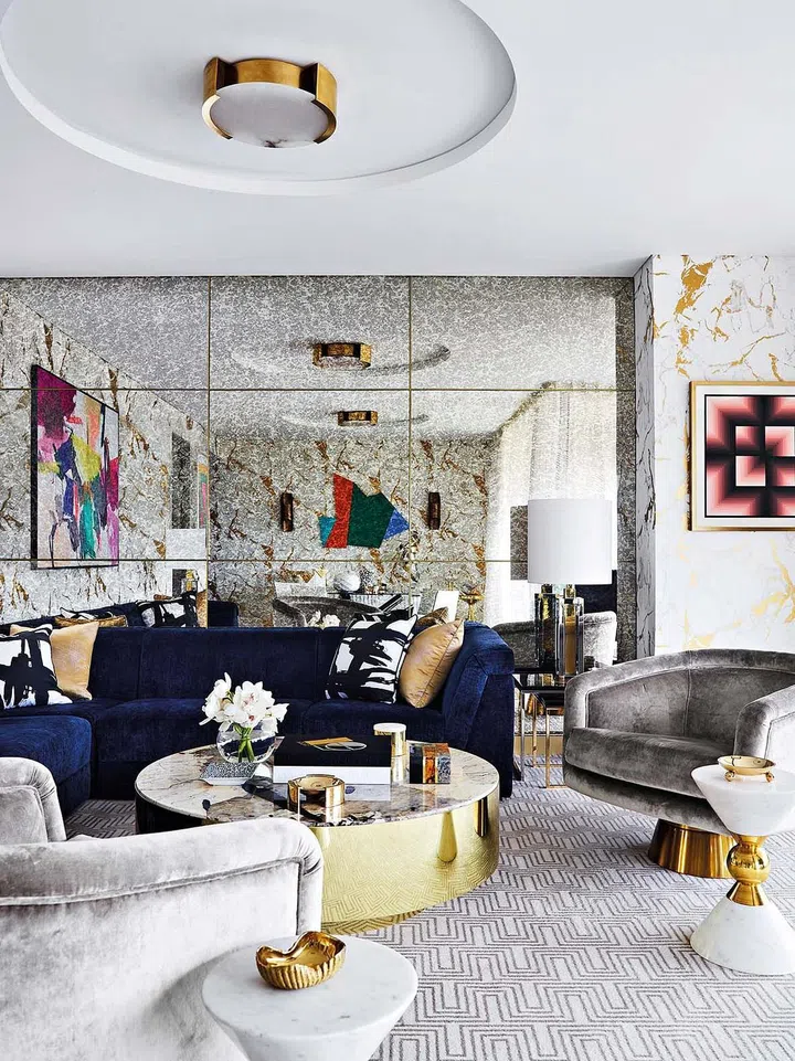 The velvet navy sofa by Jonathan Adler with gold and graphic black-and-white cushions by Greg Natale is surrounded by two beige velvet Jonathan Adler Bacharach swivel armchairs with brass bases.