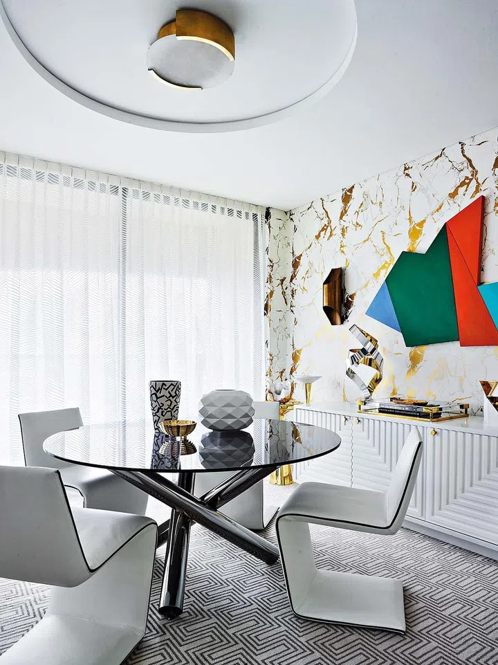 In the dining room, furnished with white leather Phillips dining chairs and a Van Dyck table with chrome legs (all by Minotti), the Melange Large Flush Mount lamp by Kelly Wearstler, a Greg Natale buffet and a Sydney Ball artwork, angles and curves blend.