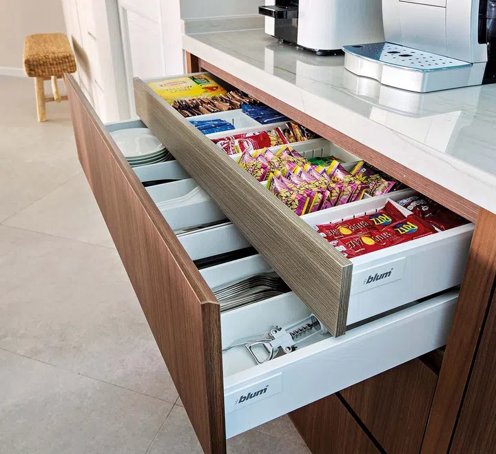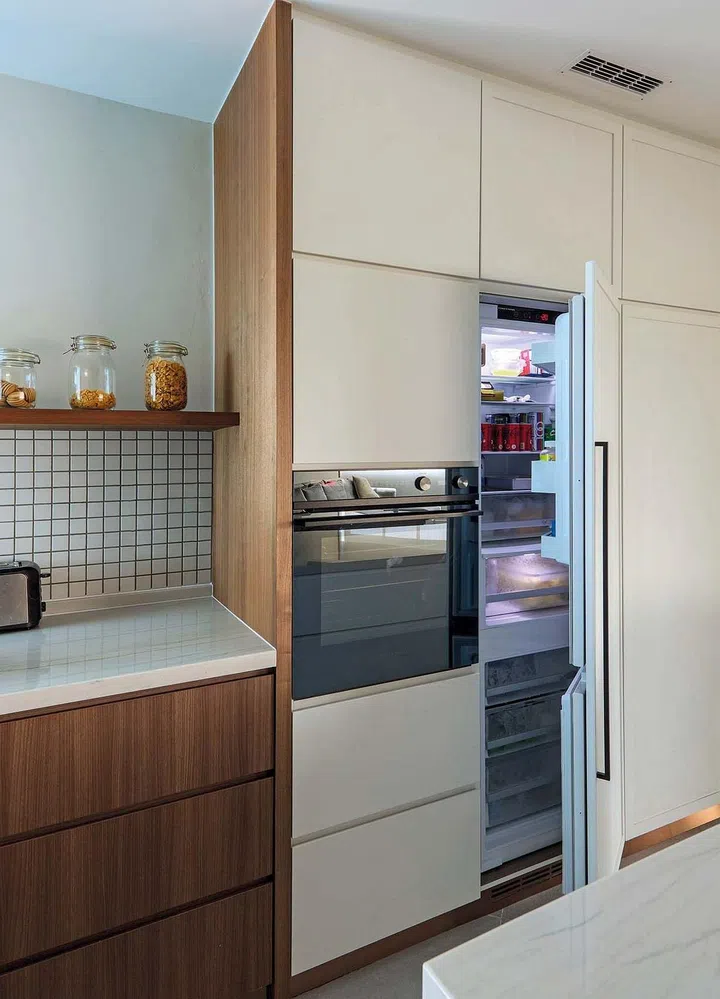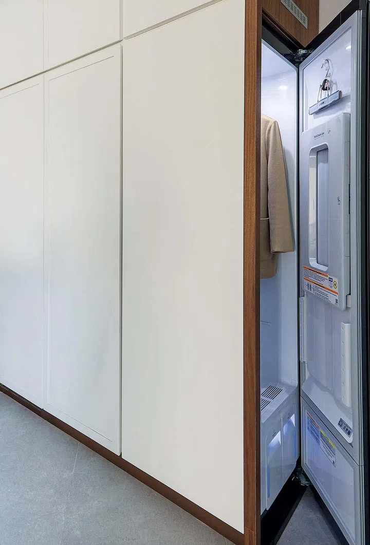 The drawers in the dry kitchen have a tiered interior for maximum snack and utensil organisation, while the white carpentry neatly contains the oven, the fridge, and an LG Styler on the side, which takes care of the dry cleaning duty.