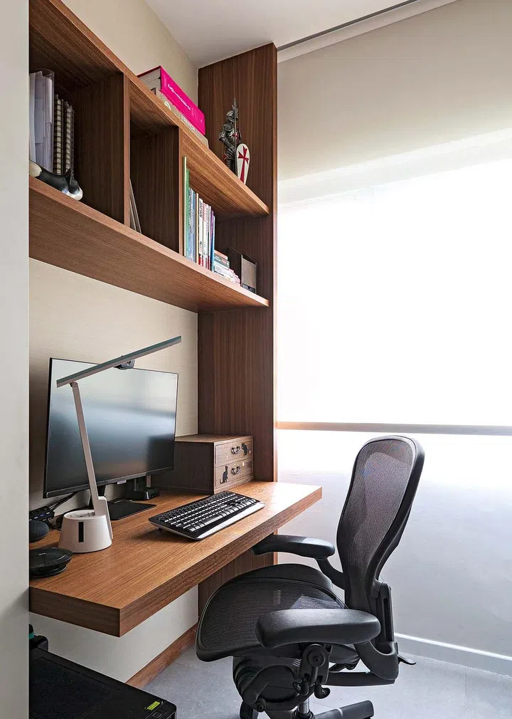 Shermaine created a storage wall to screen off the living area from the entrance. The former balcony area next to the door was cleverly turned into Shermaine's home office.