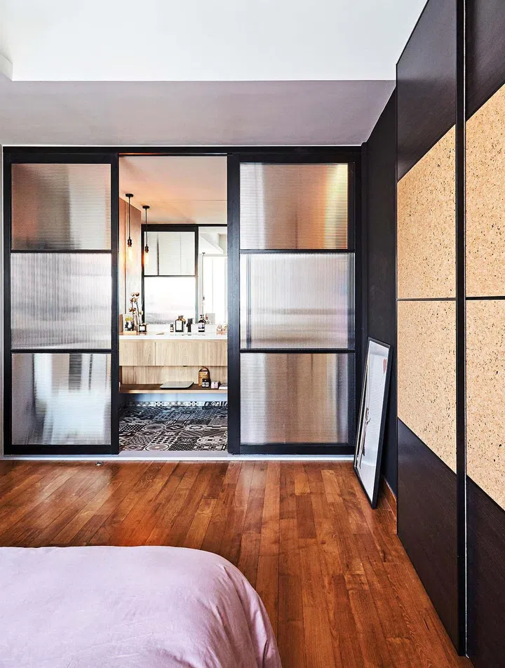 Fluted glass sliding doors separates the bedroom and the bathroom.