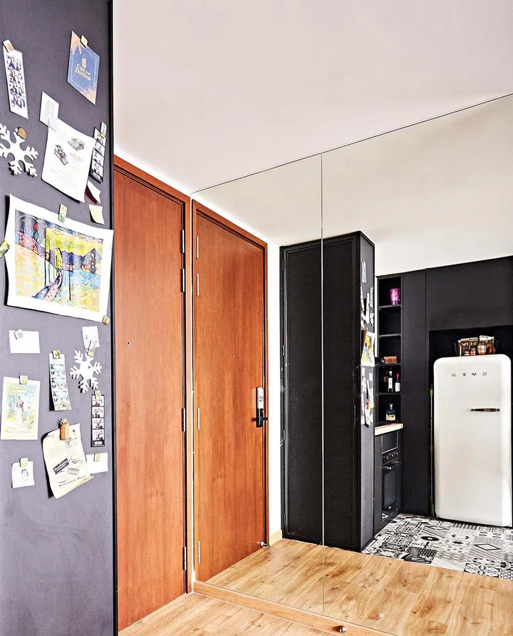 Mirrored surface doubles the visual perception of the room while a magnetic storage door serves as a noticeboard.