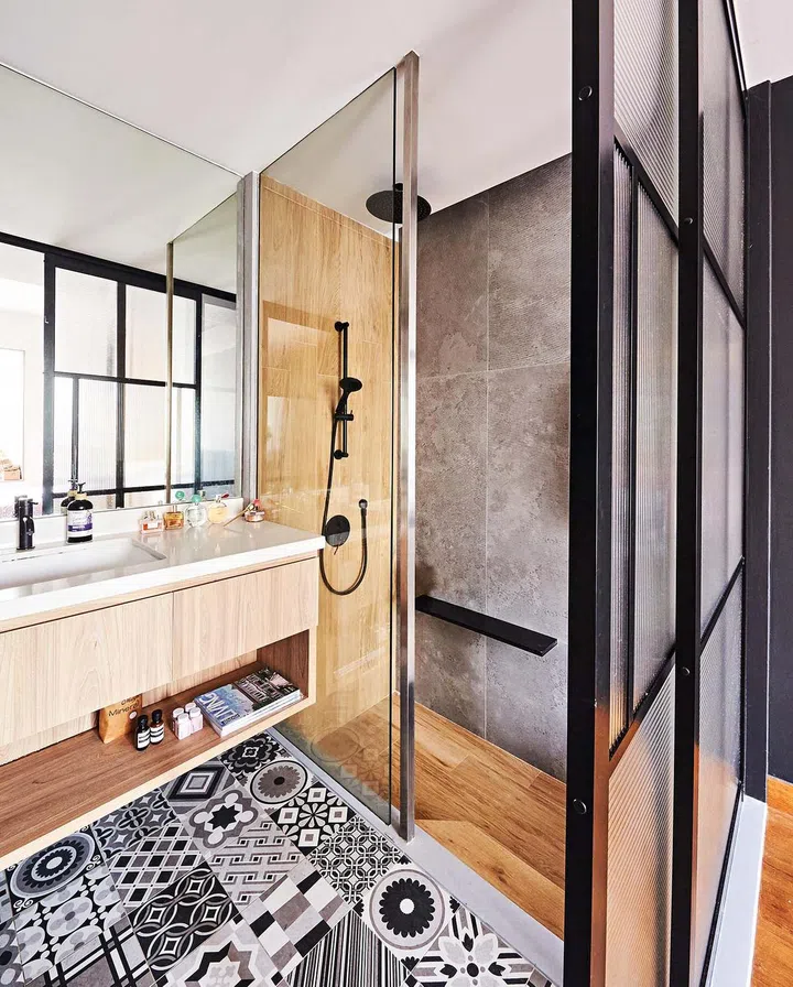 Fluted glass sliding doors separate the area from the bathroom, which features the same decorative tiles the kitchen uses for its dry area, and concrete-look tiles from Hafary for its shower area.