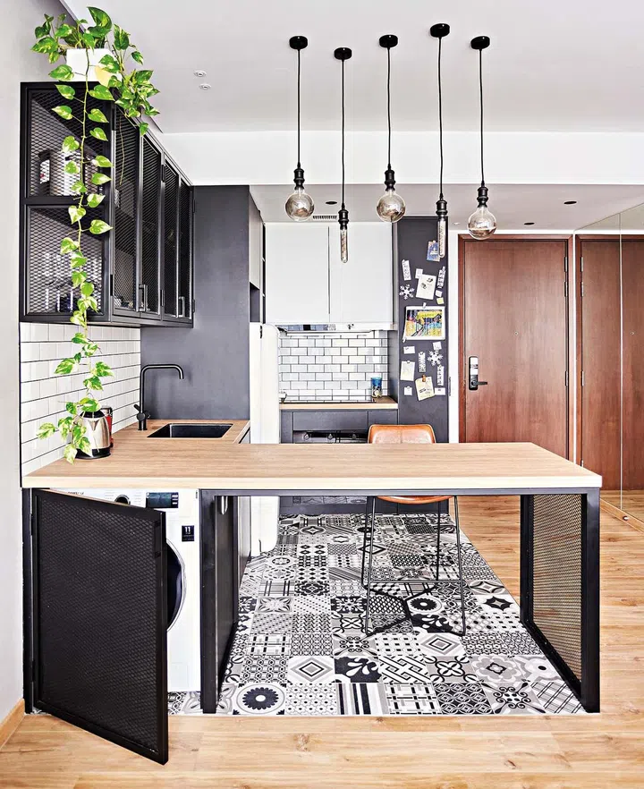 A custom L-shaped bar counter with steel mesh detailing conceals the washer-dryer and demarcates the kitchen and dining area from the living area.