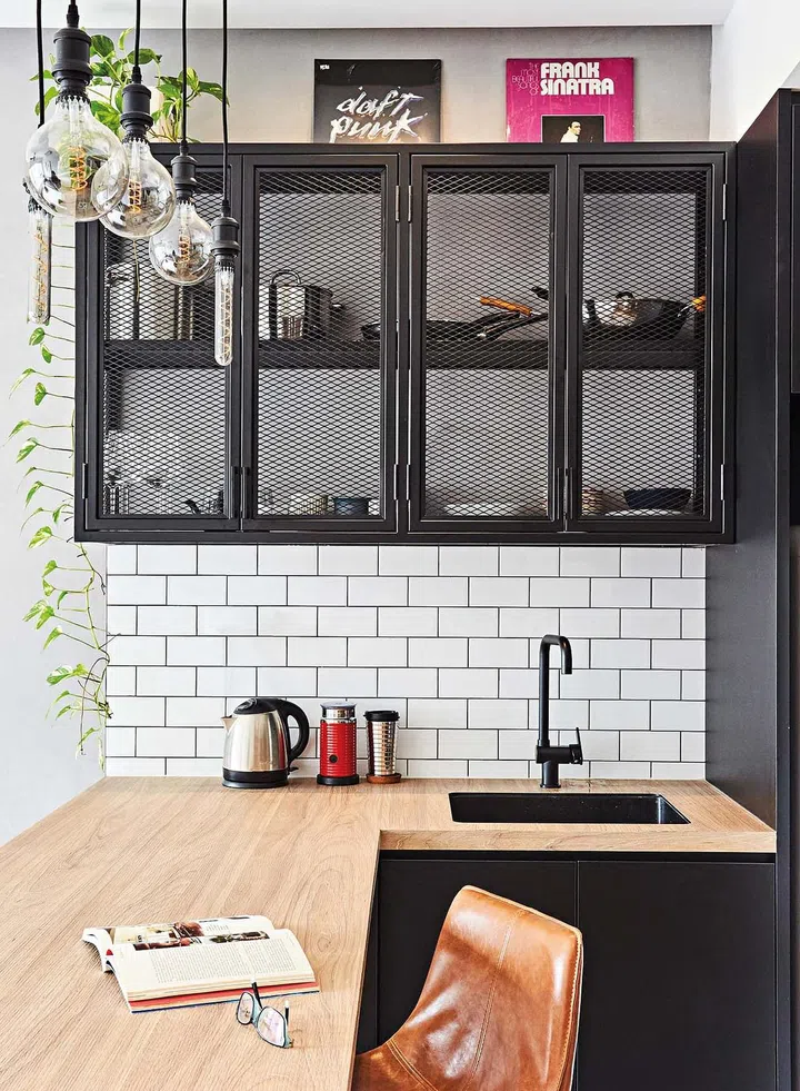 The kitchen carpentry combines a wood finish with contrasting black steel mesh, which, together with the glossy white subway tiles and smokey IKEA pendant bulbs above, create a cool industrial vibe.