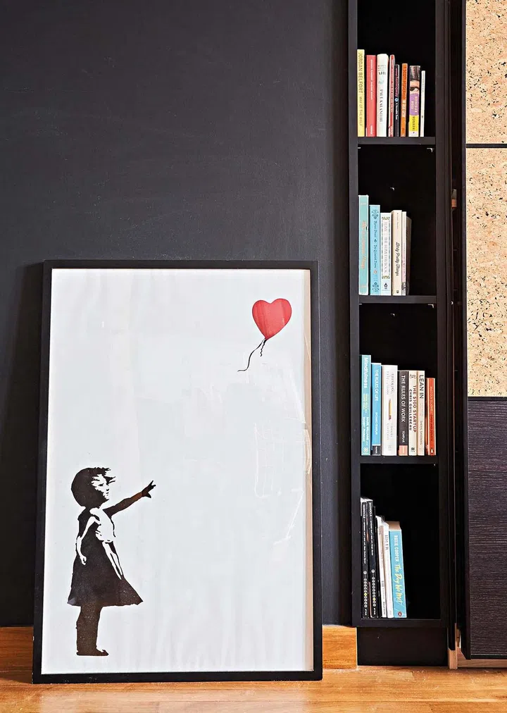 A print of Banksy’s Girl with Balloon on the floor adds visual interest.