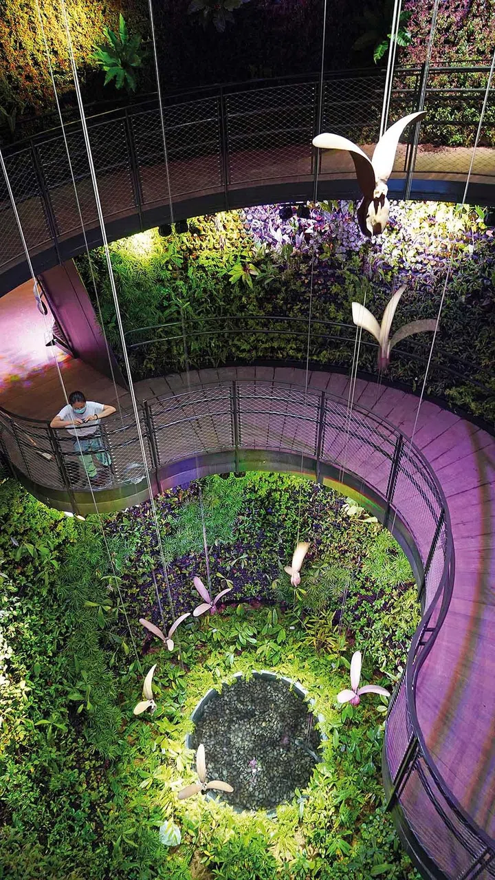 One can hardly tell where the exterior ends and the interior begins, since the greenery provides a seamless transition. Inside, three 9-metre-tall Garden Cones showcase exhibits on Singapore’s heritage and urban solutions, paying tribute to its global reputation as a City in a Garden.
