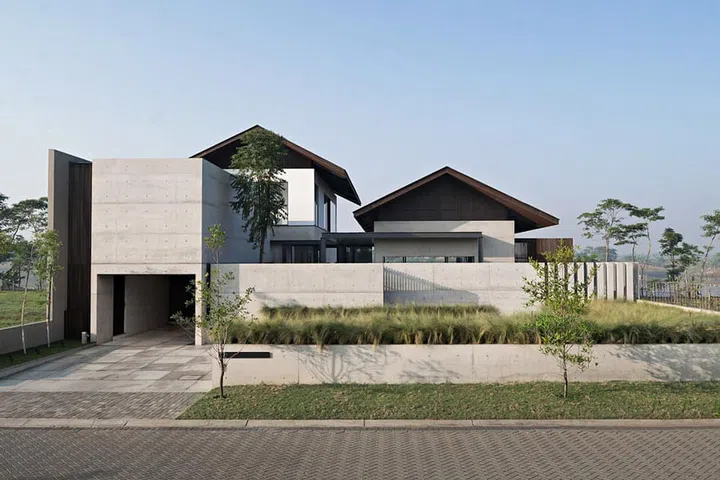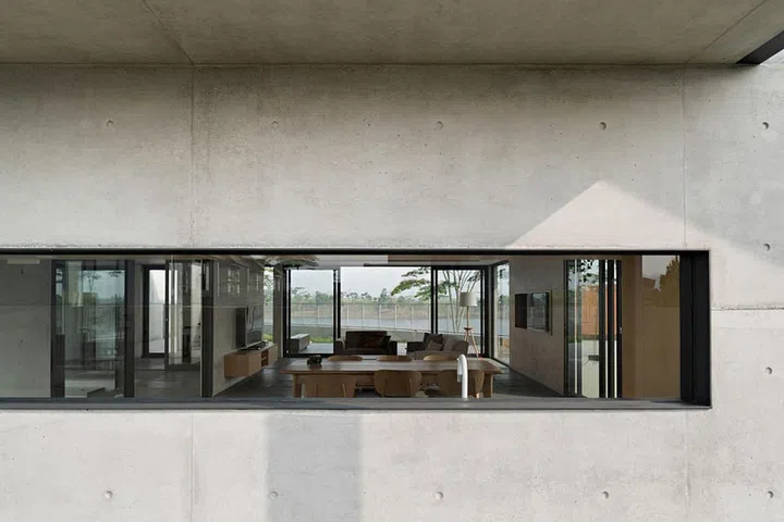 The material palette is minimal, comprising concrete and ulin wood, a local hardwood traditionally used to build piers and ships thanks to its durability against water and the weather.