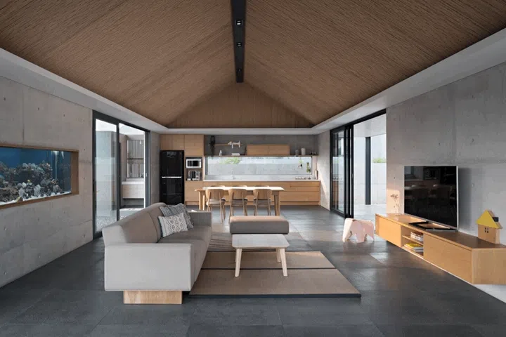 The concrete roof is exposed. The perceived coolness of the concrete architectural shell is tempered with custom timber furniture by the architects and natural rattan panels by Byo Living installed on the ceiling.